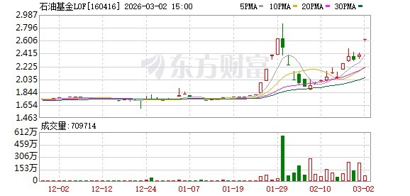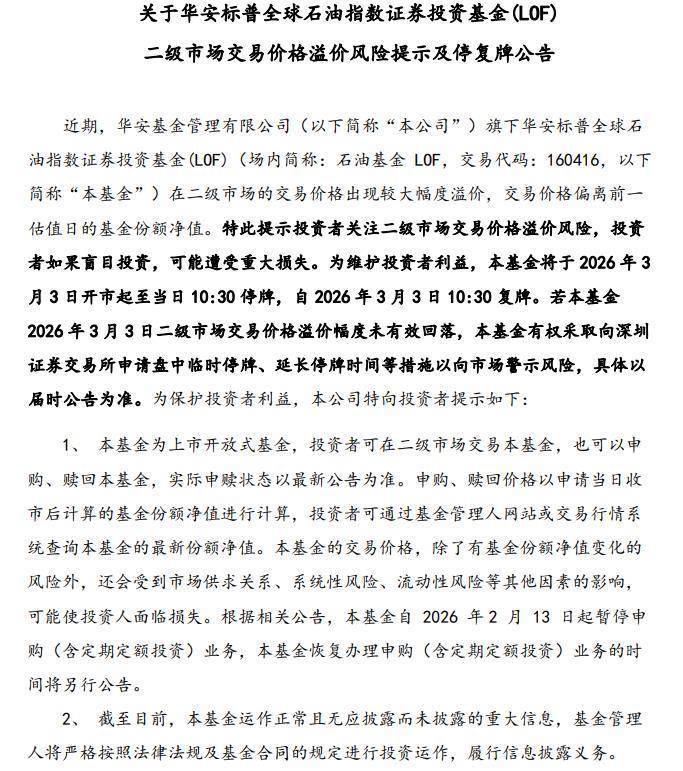 3月2日,华安基金管理有限公司公告称,近期,旗下华安标普全球石油指数证券投资基金(LOF)(场内简称:石油基金LOF,交易代码:160416,以下简称“本基金”)在二级市场的交易价格出现较大幅度溢价,交易价格偏离前一估值日的基金份额净值。特此提示投资者关注二级市场交易价格溢价风险,投资者如果盲目投资,可能遭受重大损失。为维护投资者利益,本基金将于2026年3月3日开市起至当日10:30停牌,自2026年3月3日10:30复牌。若本基金2026年3月3日二级市场交易价格溢价幅度未有效回落,本基金有权采取向深圳证券交易所申请盘中临时停牌、延长停牌时间等措施以向市场警示风险,具体以届时公告为准。