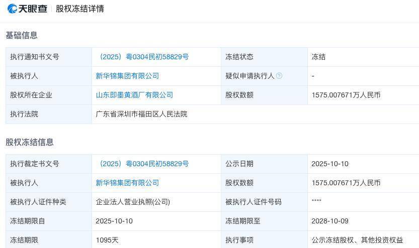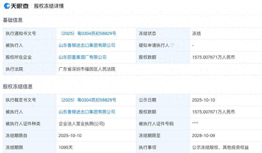 据天眼查信息,近日,山东即墨黄酒厂有限公司约1575万元股权被冻结,冻结期限自2025年10月10日至2028年10月9日,由广东省深圳市福田区人民法院执行。